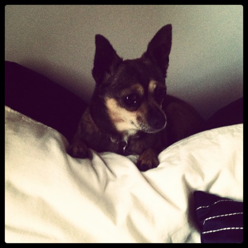 For as long as I can remember (excluding the college years), there has been a pooch hogging the bed with me at night. Even when I take care of Ginger now, she won’t go to bed until I’m ready and she’s resting next to me. And Frasier, in all of his moose-like qualities, hogs the bed regardless of how much room you have, until he’s good and comfy. And now, Chicklet, all seven pounds of her, follows me into the bedroom, waits to be put on the bed and then climbs onto the pillow until she’s snuggled in for the night. No matter how much room they take up, it doesn’t bother me one bit. Do others sleep with their pups at night? I’d love to know.