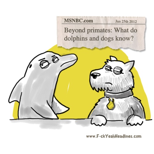 Chicklet can’t stand water, unless she’s drinking it. She won’t go outside when it rains and walks around or hops over puddles. And besides the time he fell into the pool, Fraiser doesn’t seem to have any special affinity for water either. So when I read about this pup who loves swimming with dolphins, I was seriously amused.