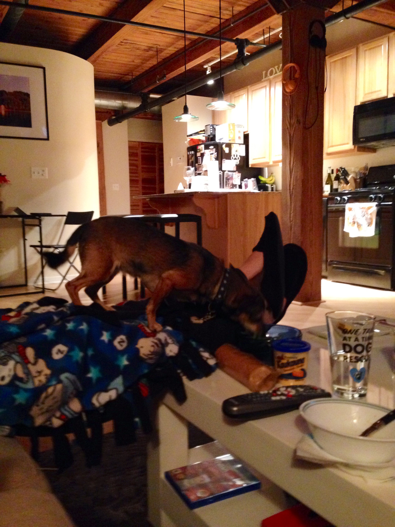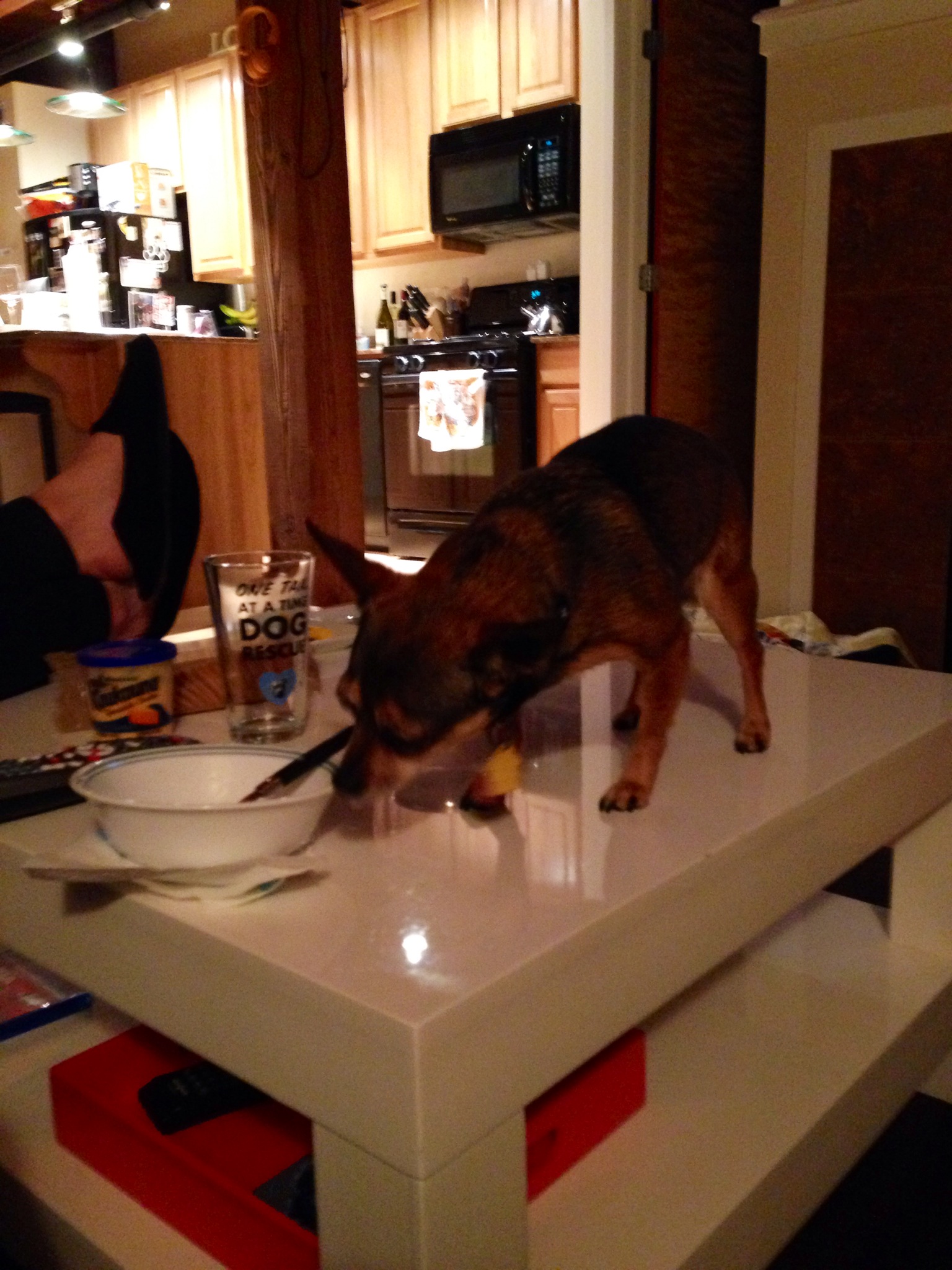 A few days later though, Chick had grown tired of the sweater and instead reached a new level of begging. She decided to crawl across our legs and onto the coffee table, where she promptly stole a mouthful of green beans. I was laughing too hard to do anything about it.