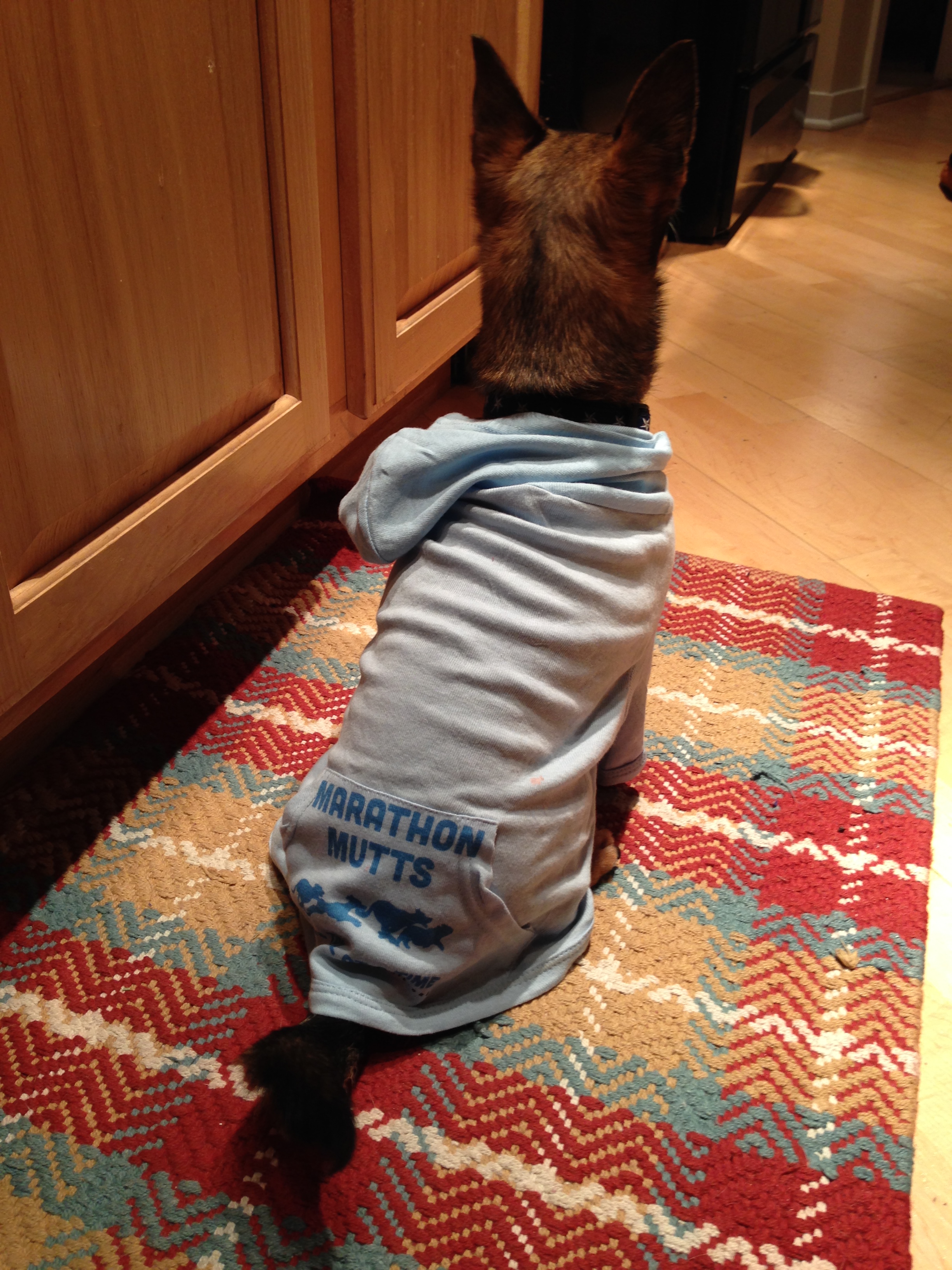 Don’t you want to be a part of Marathon Mutts? Marathon Mutts pledge to train and participate in their choice of race, run, walk, swim or ride and all proceeds go back to One Tail at a Time … pretty neat right? Our awesome board member, Kelly, manages this program and a few weeks ago she gifted me with this awesome doggy tee for Chick (namely because it was a bit tight on her own dog:). Chick was not a huge fan of it (as is the case with most clothes), but she sure gave us a laugh. I don’t think she’ll be running marathons any time soon though:)